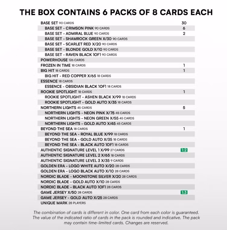 I blaster-boxen ingår garanterat: 30x Base Set, 6x Base Set - Crimson Pink, 2x Base Set - Admiral Blue, 1x Frozen in Time, 1x Big Hit, 1x Rookie Spotlight, 5x Northern Lights, 1x Beyond the Sea